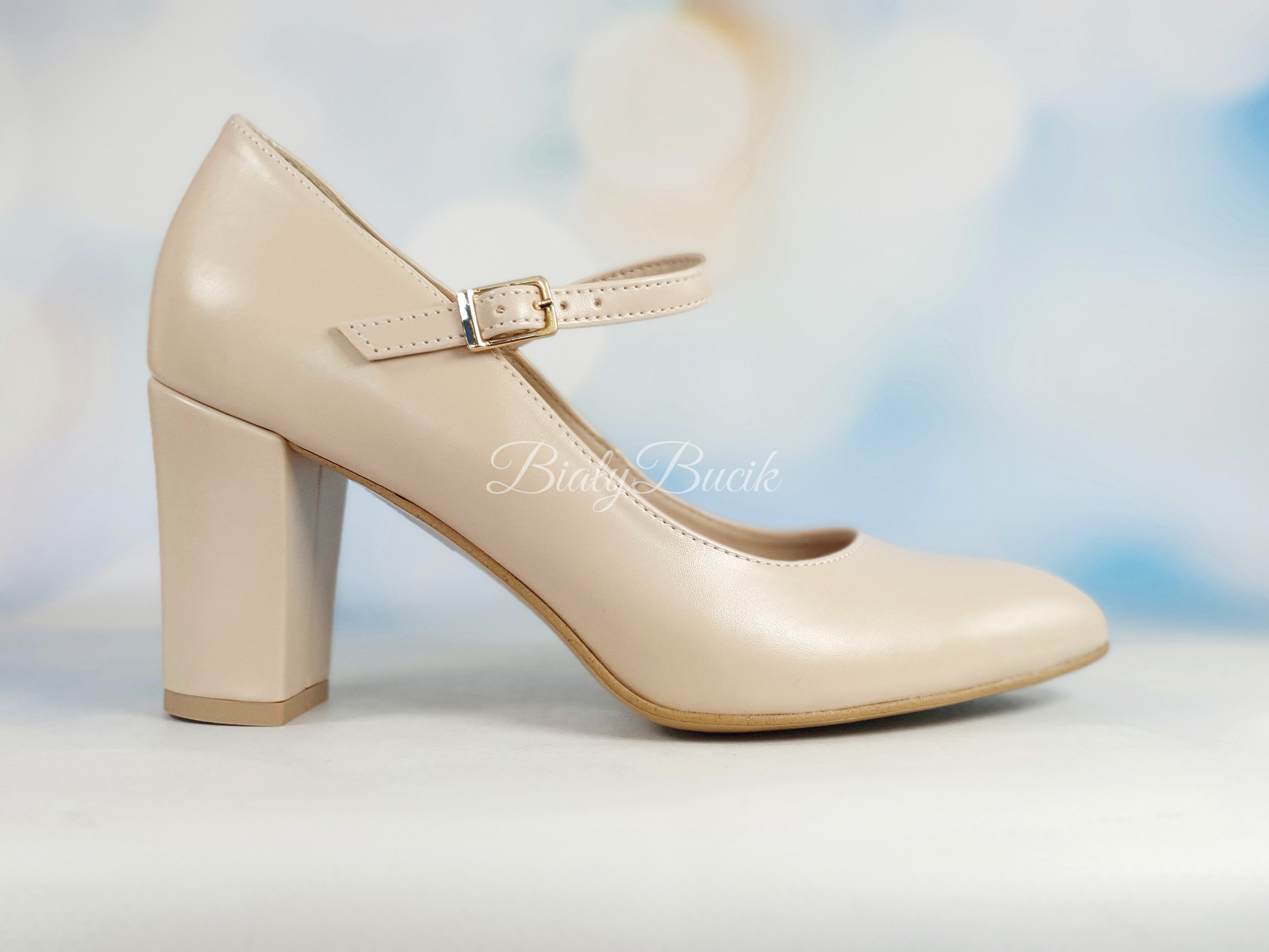 Przód  tego modelu delikatnie migdałowy.  Materiał beż matowy. Obcas słupek .Wysokość obcasa 7 cm.